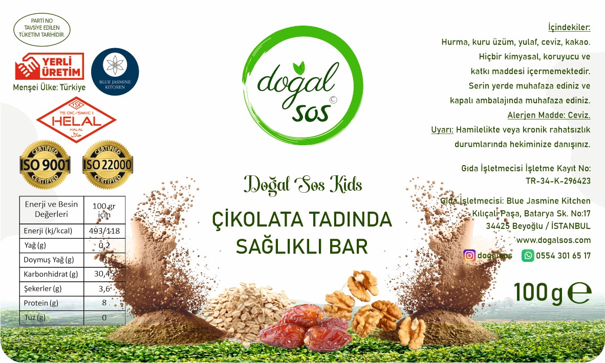 Doğal Sos’un Çikolata Tadında Sağlıklı Barı, çocuklar için katkısız, doğal ve besleyici bir atıştırmalıktır. Sağlıklı içerikleriyle tatlı ihtiyacını güvenle karşılar.