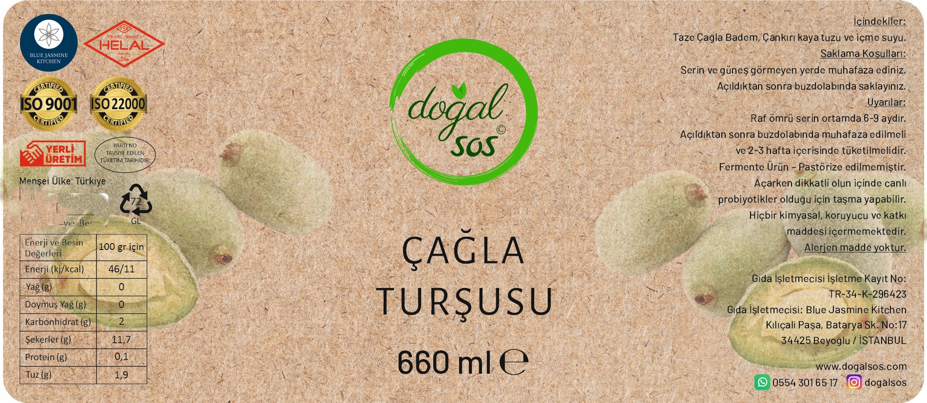 - Malzeme: %100 doğal çağla, tuz, su, sarımsak, baharatlar.