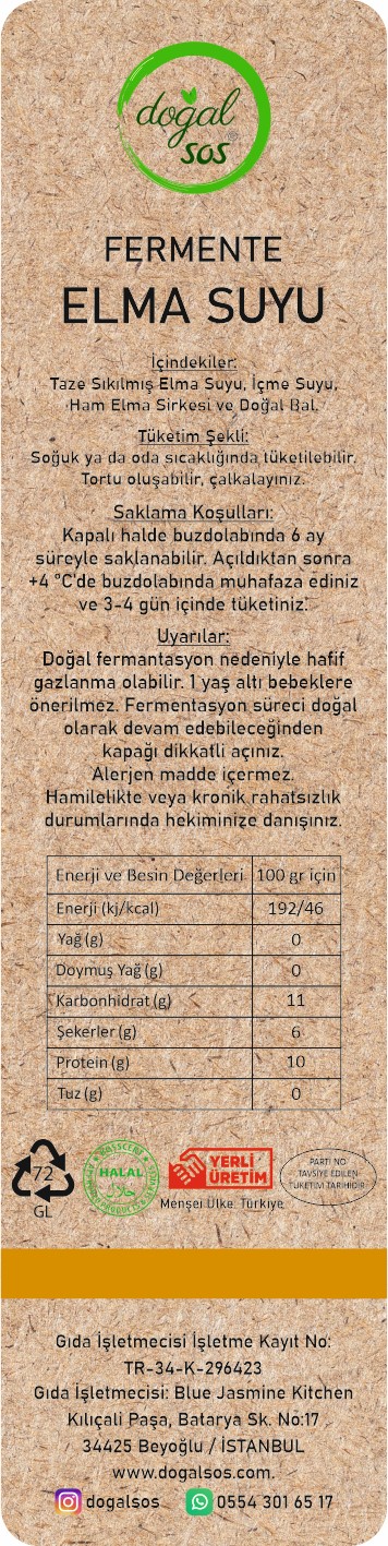 Fermente Elma Suyu, hijyenik koşullarda özenle ambalajlanmaktadır. Cam şişe içinde sunulan ürün, çevre dostu bir seçenek olarak öne çıkar. Ürünü serin ve kuru bir yerde, doğrudan güneş ışığından uzakta saklayarak tazeliğini koruyabilirsiniz. Açıldıktan sonra buzdolabında muhafaza edilmeli ve 5 gün içinde tüketilmelidir.