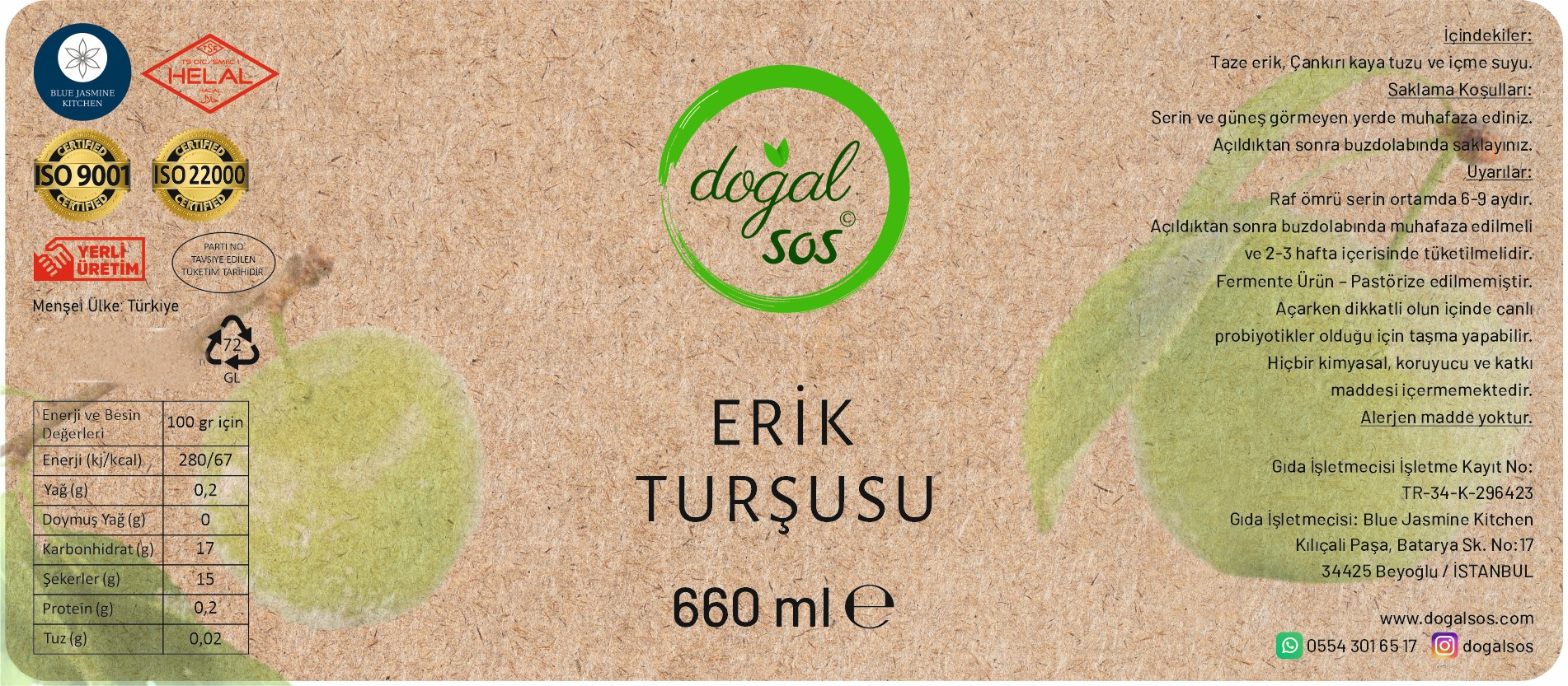 - Doğal Malzemeler: %100 organik erik, deniz tuzu ve su. Kimyasal katkı maddesi içermez.