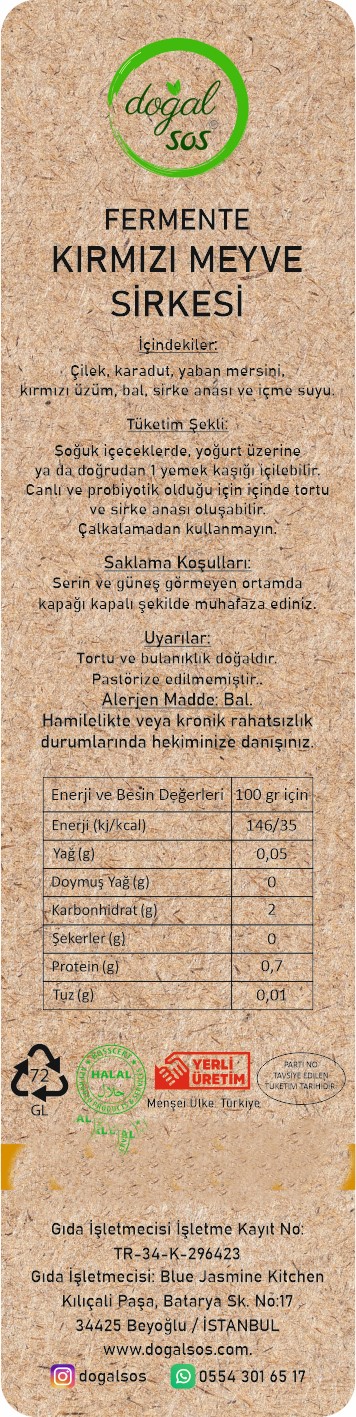 Fermente Kırmızı Meyve Sirkesi, geleneksel yöntemlerle üretilmiş, saf ve doğal bir üründür. Sağlık için birçok fayda sunması ve mutfağınızda yaratıcılığı artırması açısından mükemmel bir tercih. Dilerseniz sağlıklı yaşam tarzınızın bir parçası haline getirin, dilerseniz günlük yemeklerinize eşlik eden lezzetli bir katkı olarak kullanın. Fermente Kırmızı Meyve Sirkesi, hem lezzeti hem de sağlık faydalarıyla yemeklerinize değer katacak.