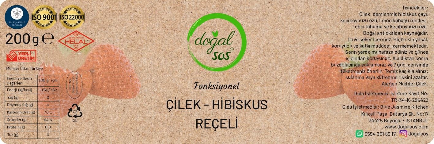 Fonksiyonel Çilek & Hibiskus Reçeli, şık cam kavanozlarda özenle paketlenmiştir. Kavanozun açıldıktan sonra buzdolabında saklanması önerilir.