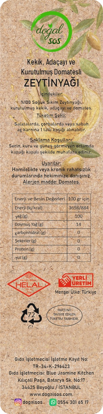 İçindekiler: Soğuk sıkım zeytinyağı, dağ kekiği, adaçayı, güneşte kurutulmuş domates.